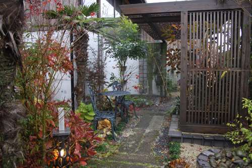 駐車場のある庭から店の入口へと続く石畳の両端には美しい草花