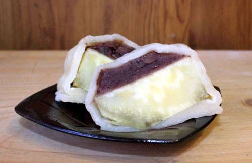 2つに割ると、サツマイモ黃色あんの2層がくっきり