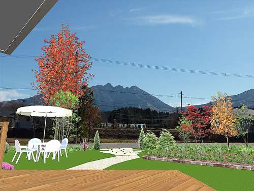 ▲掃出しの窓の先には大きなウッドデッキ。阿蘇山を眺めながらのティータイム。