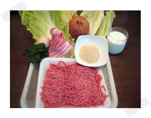 4.(1)を1枚広げ、8等分し、俵型に丸めた(3)を軸の方に載せる。手前から巻き上げ、両端の余った白菜を中に押し込み、形を整える。