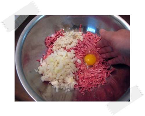 3.ボウルに(2)と牛ひき肉、牛乳、パン粉、卵を入れ、塩、コショウで味を調(diào)え、しっかりとこねる。