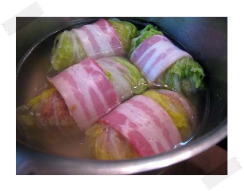 6.鍋に(5)を並べ、湯をひたひたになるまで入れ、固形スープの素を入れて火にかける。沸騰したら塩、コショウで味を調(diào)え、弱火で10分ほど煮る。味をみて塩が足りない場合は足す。