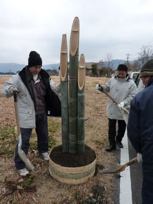 まずは、門松に絶対必要な竹を立てる作業からスタートです![]()