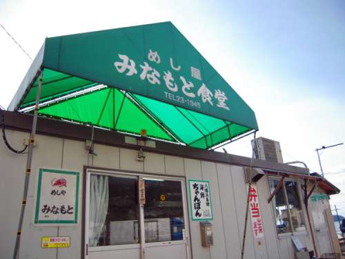 コンテナにも見えるプレハブの小さな食堂に、「みなもと食堂」の緑の看板がかかっています。