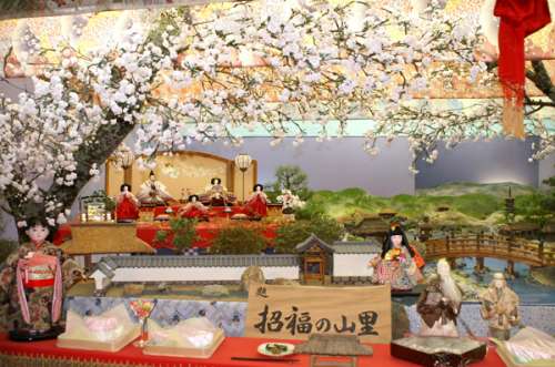 「座敷雛」は、たくさんの盆栽や石、巖、小道具を使って山野の風景や庭園を作り出し、その中にいつも見慣れたお內裏様とお雛様一式が配置された箱庭のような大掛かりな飾り。