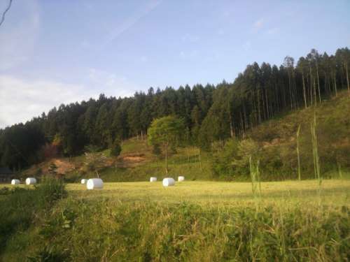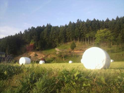 おぉ、これはですね、大きなトラクターで牧草を巨大な円筒狀にラッピングしたものな