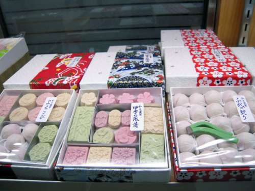 四季折々の風(fēng)物を模した生?干の和菓子が何種類もショーケースに並んでいます。