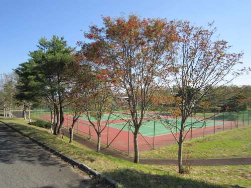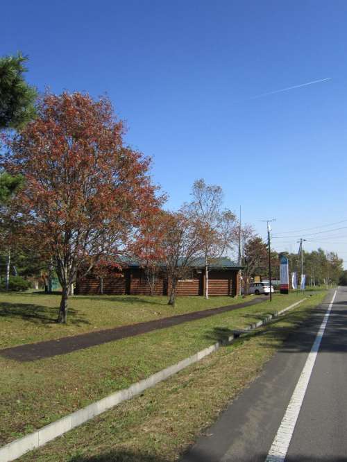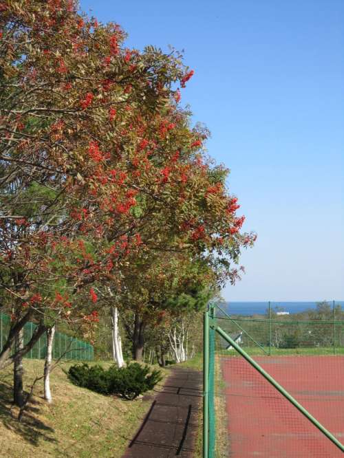 管理事務(wù)所の前のテニスコートに沿って、ナナカマドがあり、青い空に赤くなった実がまぶしく輝いています。
