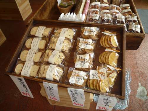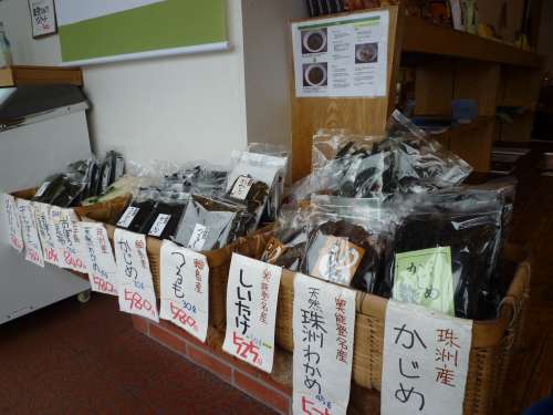 ▲奧能登のわかめ、かじめ等の海草類。    ▲人気商品!珠洲市古川商店のゆず味等のラスク