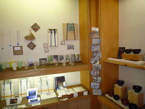 地元作家のガラス工蕓品、能登仁行和紙、輪島の漆器など。