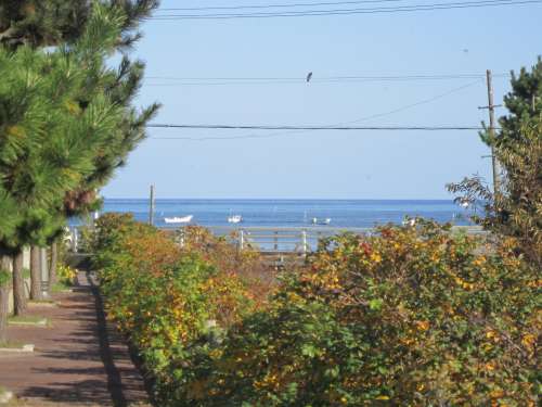 もう初冬を迎えているのですが、ここ2,3日はお天気も良く、河口向こうも雲ひとつ無く晴れ渡って清々しい、穏やか日差し、海の向こうに何隻かの漁船が見え、青い海原に浮かんでいます。