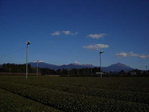 杉林の奧にそびえる~『霧島富士』(うそ)。 手前はお茶畑で、プロペラは霜よけ(本當)