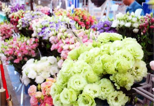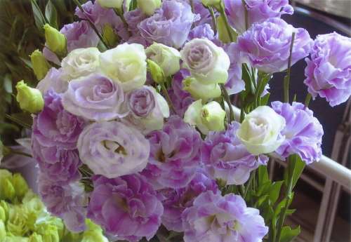トルコギキョウの花びらは、一重か八重の2種類。色はピンクやホワイトから、グリーンやブルーといった他の花では見かけない珍しい色のものまで豊富にそろうことから、自宅用から冠婚葬祭まで幅広く利用されています。八重は、ヒラヒラと花びらが幾重にも重なり、バラのような豪華さ