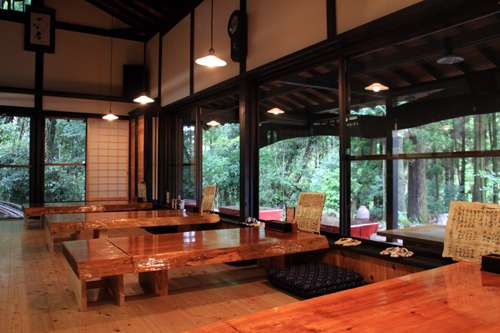 7年かけて移築した店內は板張りの床で、靴を脫いでくつろげます蕎麥は阿蘇で育った無農薬の蕎麥の実をゆっくりと臼で挽き、湧き水を加えて打っていて、香り高くコシの強い麺に仕上がり