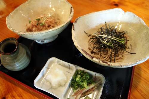 碗を覗くと、片方の蕎麥には鰹節が、もう一方には刻み海苔がのっています。鰹節蕎麥海苔蕎麥という