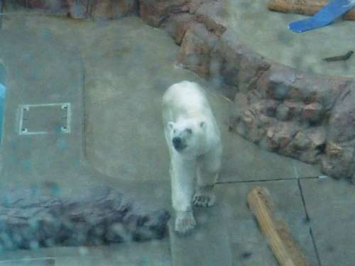 この白クマの“豪太”の為に2006年5月に人口降雪機を設置し、“豪太”の夏バテを抑える様にしたそうです、周りに確かに“雪”があります