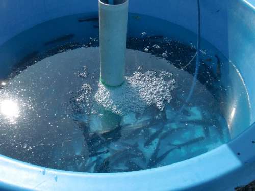 すると近くに水槽があり“八幡平サーモン”のノボリ旗が立っています、八幡平サーモンはニジマスの事、ここで、“ニジマスのつかみ取り大會”が行なわれる予定だそうです