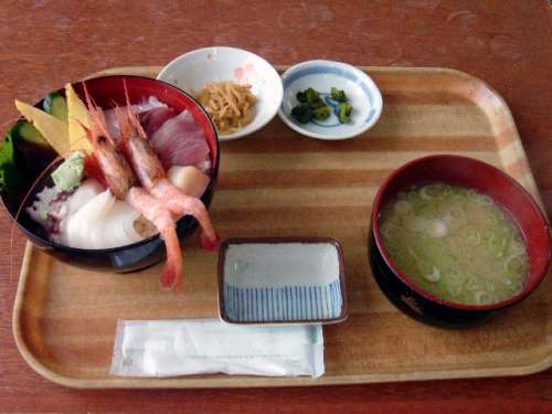 お店の中に入ると未だお晝前にも関わらず大混雑です、私は一番奧の席に座り、スタッフの女性に注文します「海鮮丼とざっぱ汁??お願いしま~す」(※ざっぱ汁??魚のアラを豪快に入れたお味噌汁)