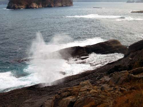 潮吹き穴(しおふきあな)は、浄土ヶ浜の北で日出島地區と休暇村陸中宮古の間の海岸にあります