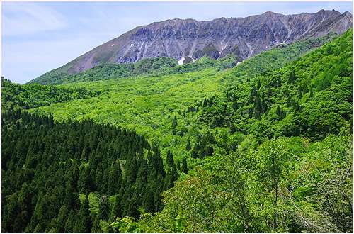 迫りくる大山南壁の下、新緑のブナの森の存在感たるや???。