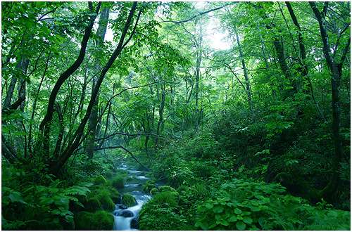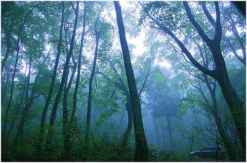 二の沢から三の沢に抜けるポイントを私たちは「ブナのトンネル」(約17km)と表現します。道の両脇、まるでアーチのように立つブナの木々によってできあがった新緑のトンネル。雨あがりのトンネルにはうっすらと霧が漂い、何とも幻想的な時間を演出してくれています。