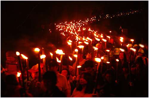 そのメインイベントの一つとして多くの観光客が訪れる前夜祭での「たいまつ行列」。大神山神社奧宮(別荘地より約8.5km)をスタートに博労座までの參道を松明を持った2000人が練り歩く様は圧巻。この日だけ、參道を流れる炎の河が大山に本格的な夏の訪れを告げてくれるのです。