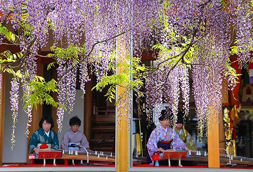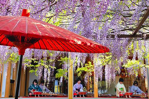 六尺藤という長い房が魅力的な藤の花はまさに下から見上げれば藤の雨。 境內に飾られる和傘とのコラボレーションが 藤の雨の雰囲気をさらに盛り上げてくれます。