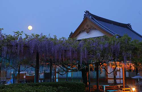 この日はスーパームーン。 いつもより大きな満月が境內と藤の花をやさしく照らします。