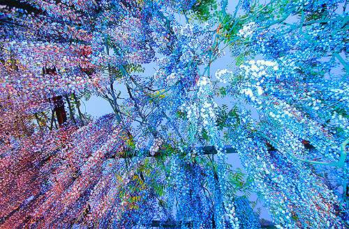 またこの藤寺のもう一つの魅力は夜。 ライトアップされた藤の花が青と赤の光で浮かび上がるさまも必見。 今年の見ごろは過ぎてしまいましたが ぜひ來年こそはみなさんもお出かけください。