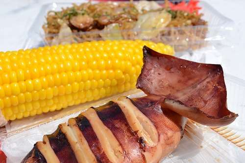 會場內には北斗市內のお店や団體などによる露店がずらりと立ち並び、いかにも夏まつりの雰囲気たっぷり。 鉄板から流れてくる焼きそばソースの香りに思わず引き付けられ、焼きイカがぷっくりと焼けてきた姿を見れば思わず小銭を取り出してしまい??????という感じでいつの間にかどんどん豪華な食卓に。