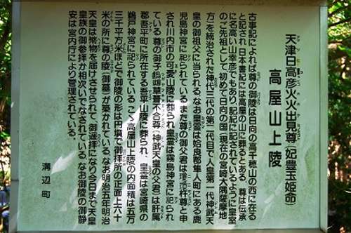 -霧島市溝辺町「高屋山上陵」鹿屋市吾平町「吾平山上陵」 海幸彥と山幸彥の神話をご存知だと思いますが、古事記に出てくる兄弟喧嘩のお話です。海幸彥(ホデリノミコト)が兄、山幸彥(ホオリノミコト)が弟です。ある日、山幸彥が海幸彥の道具を借りて海に漁に出かけますが、その釣針を無くしてしまったことから爭いが始まります。 その兄弟喧嘩ですが、弟の山幸彥が勝って天皇家へとつながり、負けた海幸彥は隼人族の祖となったともいわれています。ちなみに、天上からこの地上の高千穂の峰に降りてきた天孫降臨伝説。その降り立った神様がニニギノミコト。海幸彥と山幸彥はニニギノミコトの子ども達です。 ここ「高屋山上陵」は山幸彥(ホオリノミコト)の御陵(天皇家の墓)とされ“神代三上陵”のひとつで、薩摩川內市の可愛(えの)山上稜、鹿屋市吾平町の吾平(あいら)山上稜、に並ぶ神代の皇室の墳墓が宮內庁管理のもと治められています。山幸彥(ホオリノ ミコト)は神武天皇(初代天皇)の祖父にあたります。 霧島市溝辺町の國道504號を北へ4キロほど進むと、右前方にこんもりとした小高い森が見えてきます。様々な種類の木々が生茂り、巨樹の木立が並ぶ真っ直ぐとした石段を上ると拝禮所がありました。昭和天皇や今上陛下が皇太子の頃に美智子妃と御參拝された碑が建っています。昭和天皇が御參拝された折には元師海軍大將 東郷平八郎が付添人として參拝されたようです。 高屋山上陵の東南方向に位置する丘は山幸彥の妻になった豊玉姫を見初めたところから「みそめヶ丘」といわれていて、溝辺(みぞべ)の語源とも言い伝えられています。ホオリノミコトの御霊は鹿児島神 宮に祀られています。