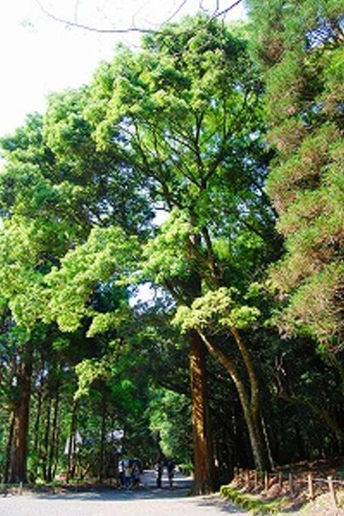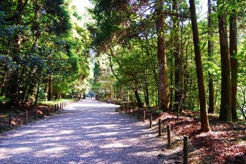 霧島市溝辺町の國道504號を北へ4キロほど進(jìn)むと、右前方にこんもりとした小高い森が見えてきます。様々な種類の木々が生茂り、巨樹の木立が並ぶ真っ直ぐとした石段を上ると拝禮所がありました。昭和天皇や今上陛下が皇太子の頃に美智子妃と御參拝された碑が建っています。昭和天皇が御參拝された折には元師海軍大將 東郷平八郎が付添人として參拝されたようです。