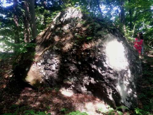 この巨石の半分の肌には小石が折り重なるように積まれ