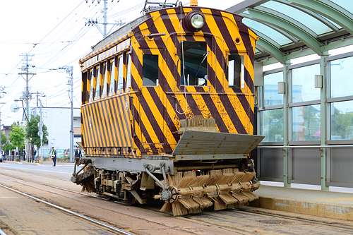100周年を記念して行われた「列車(chē)大行進(jìn)」には、冬にしか登場(chǎng)しない 「ササラ電車(chē)」も登場(chǎng)しました。車(chē)體の前に取り付けたブラシを回転させて 軌道上の雪を跳ね飛ばす、働く車(chē)です。