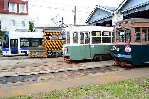 復(fù)刻花電車(chē)のお披露目が行われた「駒場(chǎng)車(chē)庫(kù)」敷地內(nèi)には、 現(xiàn)役の客車(chē)としては最も古い昭和26年製の車(chē)両から、 最新式の超低床車(chē)両まで新舊の車(chē)両がずらり。