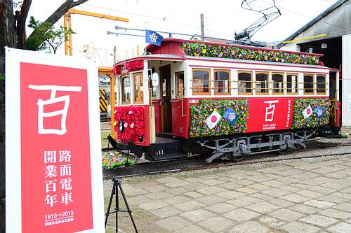 開(kāi)業(yè)100周年當(dāng)日にお披露目された「復(fù)刻花電車(chē)」。 函館市電には「函館港まつり」に合わせて運(yùn)行する花電車(chē)が3両ありますが、 客車(chē)ではないため一般の乗客が乗ることはできません。ところが今回の復(fù)刻花電車(chē)は、 通??蛙?chē)として運(yùn)行しているチンチン電車(chē)を使用しているため、 他の車(chē)両と同様に乗車(chē)することができます。 飾りは大正時(shí)代の寫(xiě)真を參考に、當(dāng)時(shí)を再現(xiàn)したものだそうです。