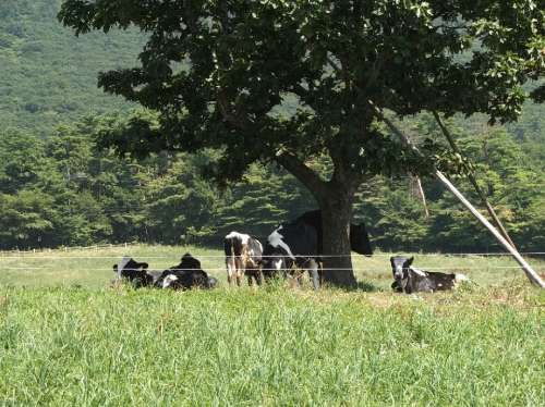 お盆期間で多くの観光客の方が大山をバックに記念撮影する中、大山放牧場の乳牛たちは優雅に涼しい木陰でのんびりと。