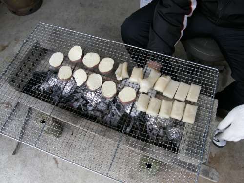 左義長を見ながら、お餅とサツマイモを炭火焼き