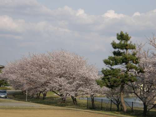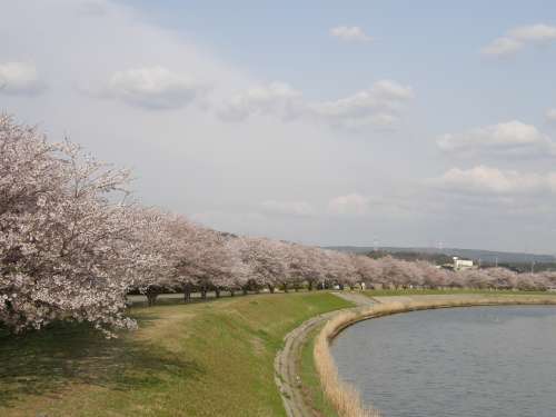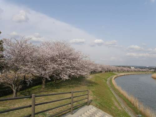 於古川に沿って咲く桜は見事で、桜並木を散歩したり、お花見をしている方も