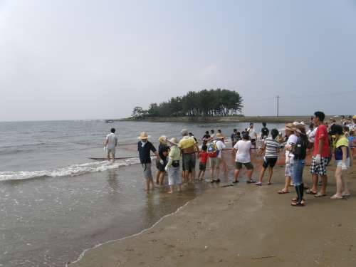 志賀町安部屋海岸で沖合いに仕掛けた網をみんなで力を合わせて引き寄せます。