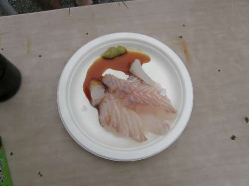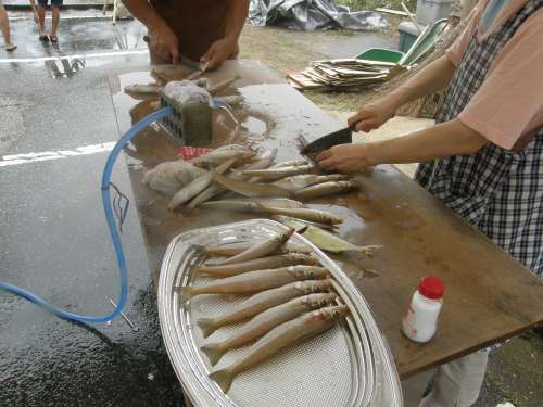 獲れたての新鮮な魚をその場で捌いて刺身と塩焼き。オーナー様から「おかわり」の聲も???。