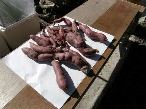 小さい芋を植えておいたら芽が出て、蔓が伸びサツマイモが出來たそうです。