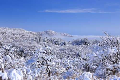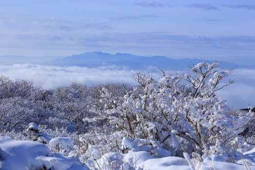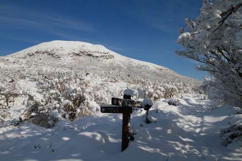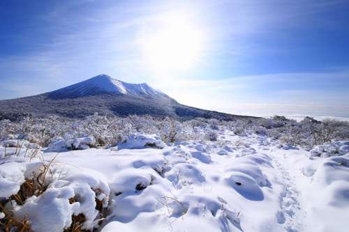 霧島市の國分平野では、 既に梅の花が咲いています。 しかし、 立春とは名ばかりの寒さ?、 霧島連山では、 冬の名殘りがなかなか去らず春はしばらくお預けの日々が続いています。 2月11日、 霧島の山並みは雪景色。 なので、 高千穂峰が望める高千穂河原から中岳へ向かう遊歩道を歩いてみました。 シーンとした空気の流れる音の中、積雪した遊歩道をサクッサクッと音を立てて、ひざ下まで積もった深雪を進みます。 白銀のそれは澄んだ空の青が一段と輝かせます。 見渡す限りの雪景色は、日頃見慣れないせいか、季節の中では最も美しい眺めかもしれません。 木立にかぶった雪は、 今にも折れそうなほど激しく揺さぶられ、太陽の光を浴びてサラサラと滑り落ちて軽やかに溶けていきます。 中岳へ向かう遊歩道から見下ろせば雲海が広がり、高千穂峰を見上げれば、広がる青い空が心持ち濃くなった気がします。 時折、上空を流れる薄い雲は、ゆっくりと穏やかに動いています。 植物を覆った雪を払い除けると微かな緑を覗かせます。 そうか、暦の上では春の季節なのだな。 たまに降る雪も、椿や梅の蕾も、桜やミヤマキリシマの新芽も、 空を行く雲さえも、そろそろ春に切り替わることを知っています。 雪が融けて、木々の芽が膨らみ花々の咲く春の來ることは嬉しいです。 でも、雪が降り続いたあとに広がる真っ青な空。 冬の冷たい空気に包まれながら、この美しい風景を目の前にしたとき、 冬の霧島連山の素晴らしさを実感しました。