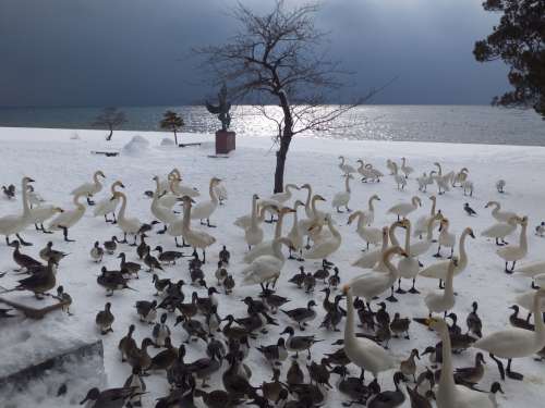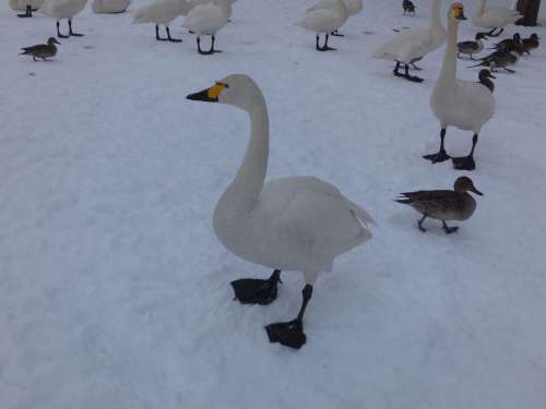 當日は曇りがちの夕暮れ時で、白鳥やカモ達が群れをなしていました