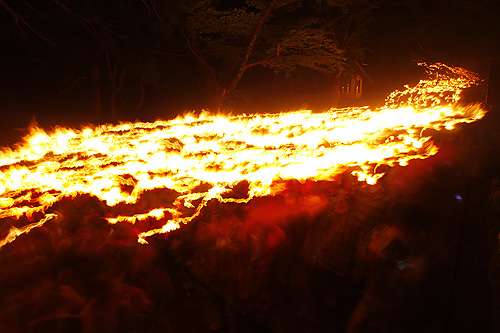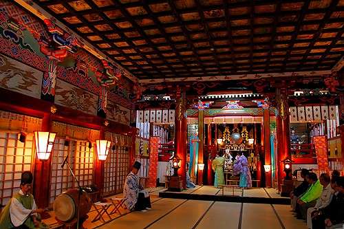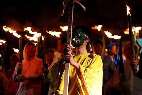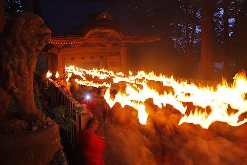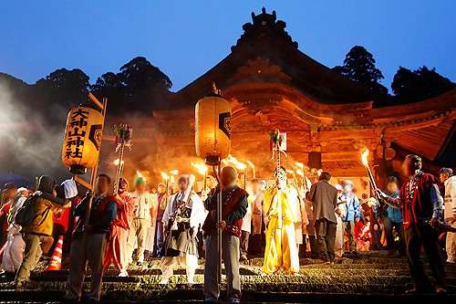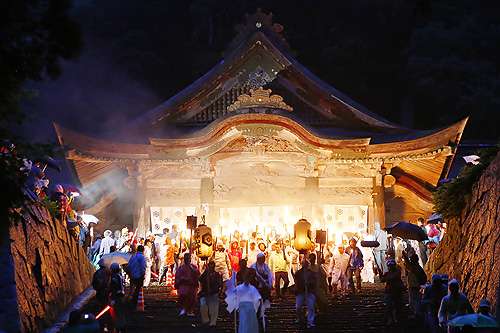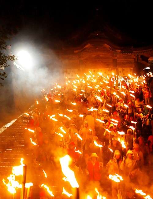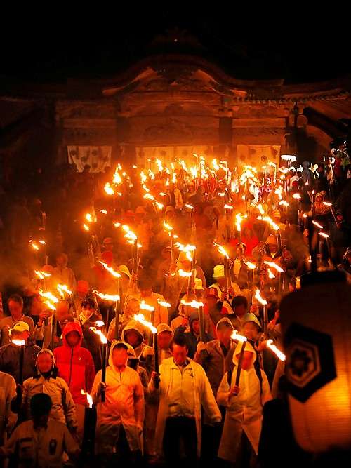 特に観光客の注目を集めるのが前夜祭として開催される「たいまつ行列」で、神事を終えた社殿からゴールとなる博労座をめざし、神の火を持つ2000人が松明行列となり參道を練り歩きます。 その様はまさにたった一日だけ流れる炎の河。 毎年全國から観光客が訪れ、荘厳で神聖な炎に包まれた夜を満喫。 忘れられない思い出として多くの人に感動を與えています。