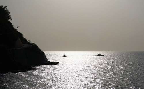 日本海から朝日が昇る午前6時頃、定置網で穫った魚をのせた二艘の船が美保関港に帰港します。