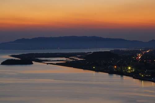 見渡す限りのパノラマビュー。オススメは夕暮れで、中海に沈む夕日、そして振り向けば赤く染まる大山。