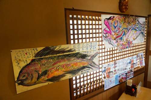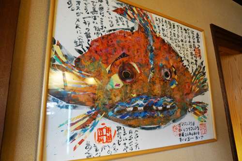 今回のお目當ては、まつや定食(稅込み2700円)と1日限定20食の海鮮丼(稅込み1,296円)です。 さっそく注文すると、殘念ながら海鮮丼は売り切れ。かわりに1日限定20食のウニ丼セット(稅込み2,160円)を注文しました。 お店の至る所に飾ってある大將直筆の水彩畫を鑑賞しながら料理を待ちます。