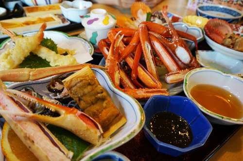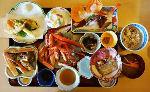 続いてやってきたのが、まつや定食。まるで先程眺めていた絵のように色鮮やかな定食です。角がくっきりと立ったお刺身、サクサクの天ぷら、しっかりと味が染みた煮魚、ベニズワイガニ、うに板、貝の旨みを吸った貝飯、酢の物、茶碗蒸し、カニ汁。お盆に入り切らない品數です。