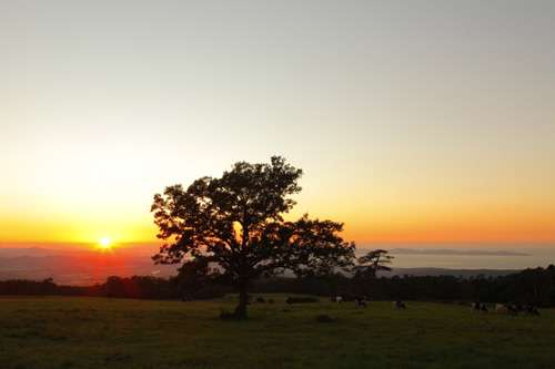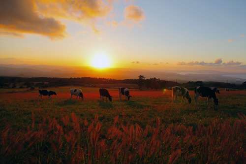 まだまだ日中は暑さが殘る9月初旬。 暑さから逃れるべく大山へと足を運ぶと、放牧場でのんびりとお食事中の牛たちを発見。 下界へと沈む美しい夕日にも目もくれないその姿に、 なんだかフッと笑顔にもなってしまいますね。